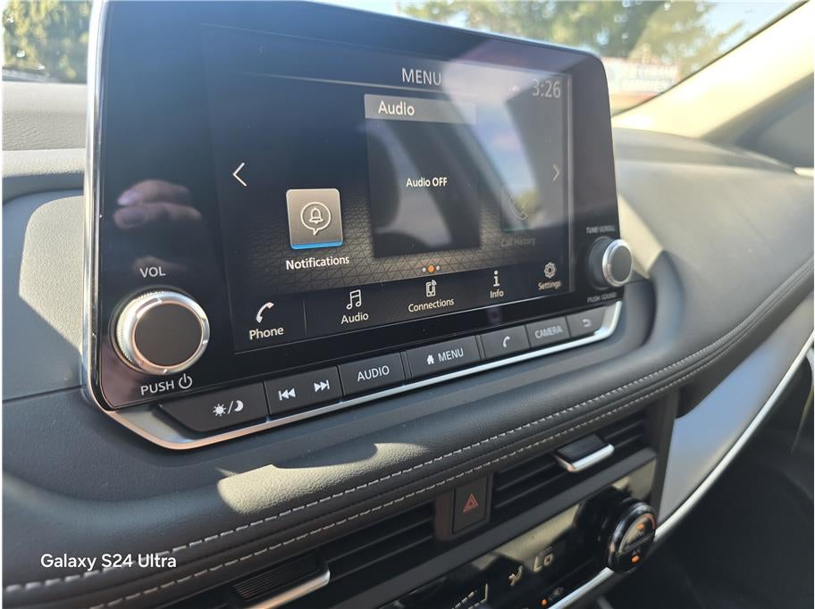 - Radio: AM/FM NissanConnect -inc: 6 speakers plus 2 tweeters, Apple CarPlay, Android Auto, 8" color touch screen display, Bluetooth®, 2 front USB type-C, Wi-Fi hotspot and NissanConnect Services powered by SiriusXM